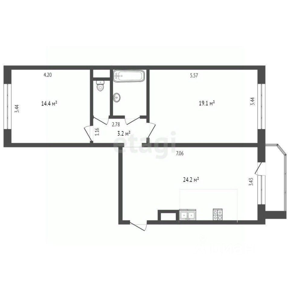 Эта квартира с удачной планировкой-распашонкой идеально подойдет для комфортной жизни семьи с детьми. Просторная кухня-гостиная (24 кв.м.) станет любимым местом для семейных обедов, а светлые комнаты (14 и 19 кв.м.) позволят каждому члену семьи иметь свое личное пространство.