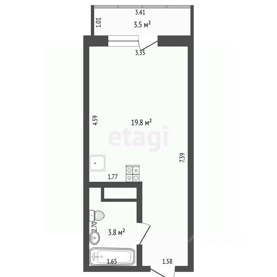 Планировка отличается функциональностью: при входе организован просторный коридор, ведущий в основную комнату, а санузел совмещенного типа позволяет разместить всю необходимую сантехнику и технику.