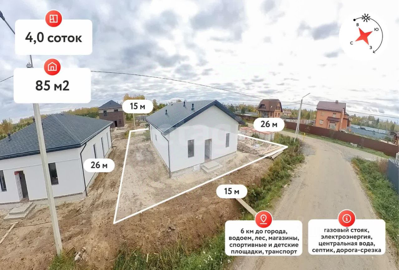 На земельном участке площадью 4 сотки расположен уютный дом общей площадью 86 кв.м. Подъезд к дому можно организовать с двух сторон. Внутри вас ждет современная планировка: просторная кухня-гостиная, две светлые спальни, одна из которых оборудована собственной душевой комнатой — идеальное решение для уединения и комфорта (мастер-спальня).