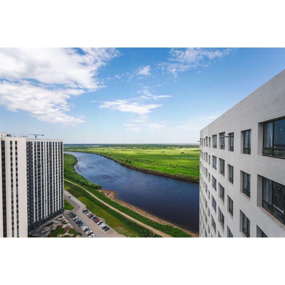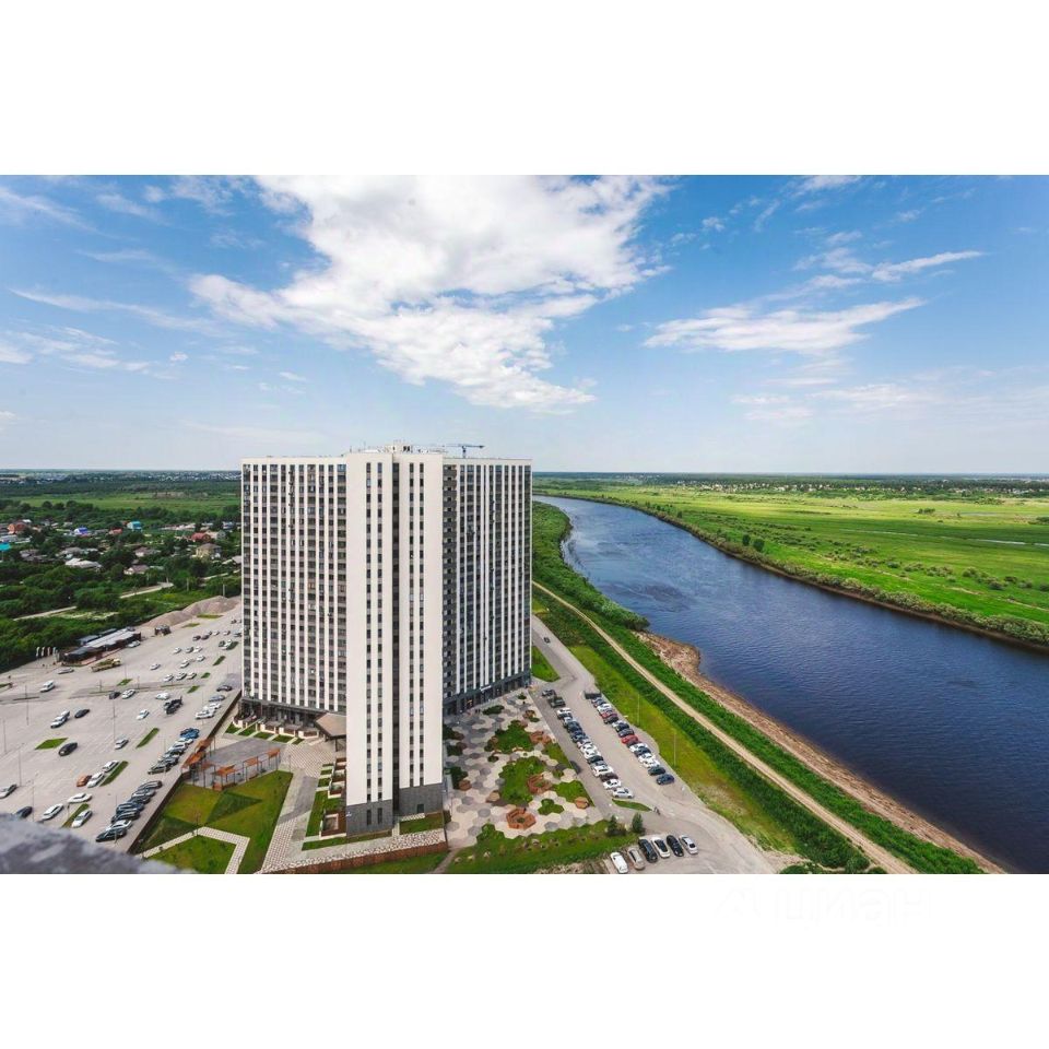 Жилой комплекс на берегу Туры с живописным видом на реку, Мост влюбленных и исторический центр.