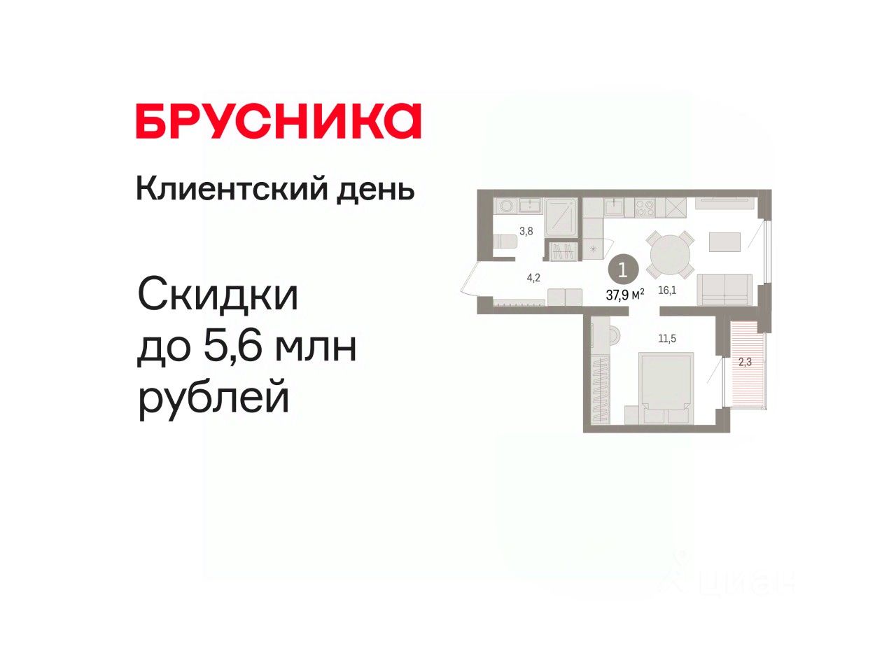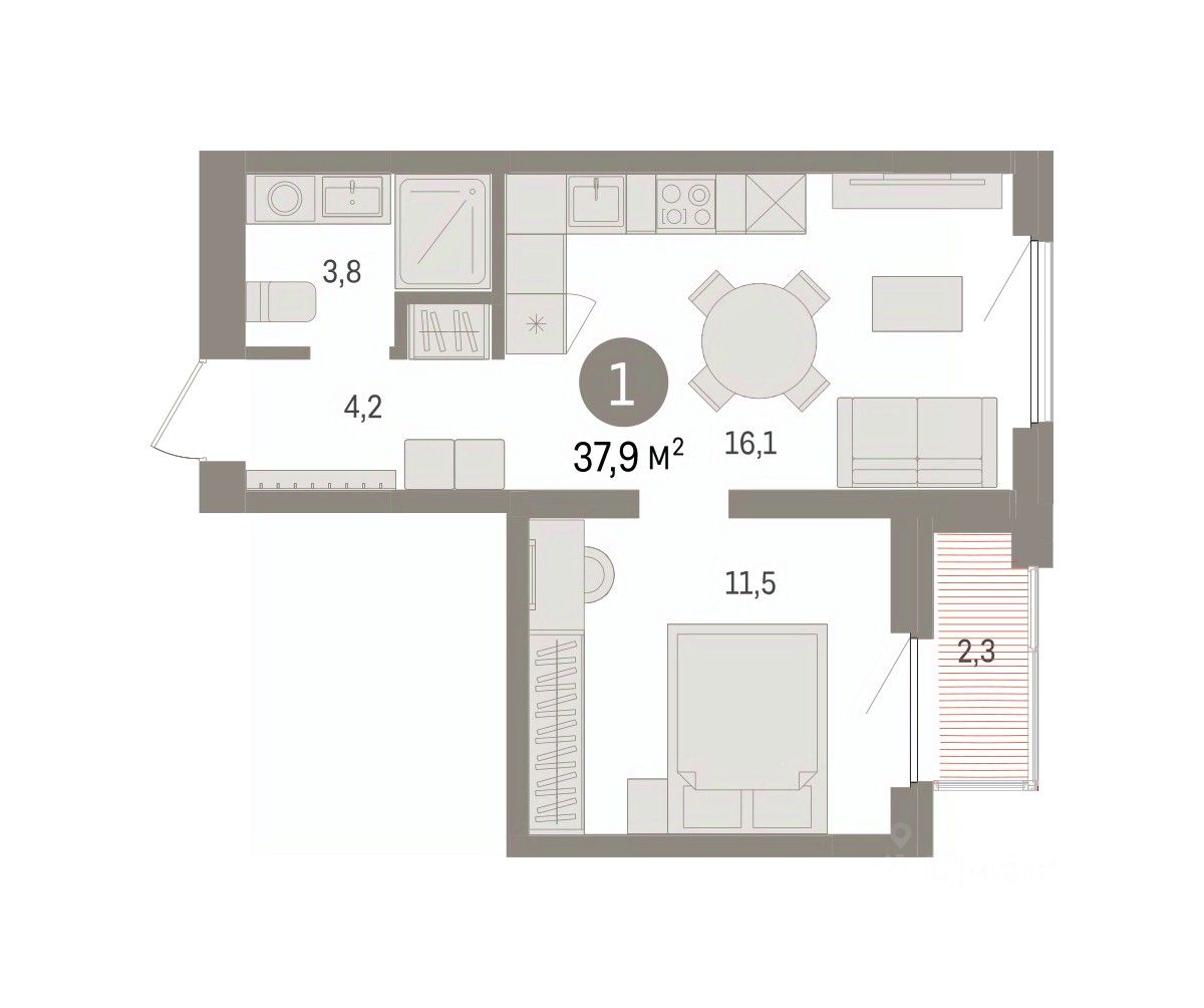 Квартира с кухней-гостиной и одной спальней в жилом районе ''Зарека''. Особенности планировки: лоджия, окна в пол, предчистовая отделка. О доме Замкнутый квартал высотой 8 этажей с 16-ти этажной башней-доминантой и двором на стилобате двухуровневого паркинга.