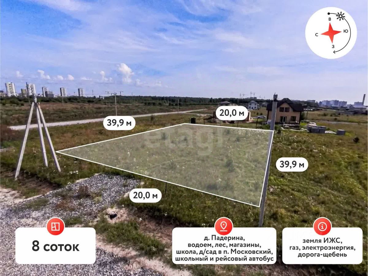 Основные характеристики: - Размер: 8 сот. - Назначение: ИЖС. - Локация: участок находится в тихой и спокойной деревне Падерина (Московский тракт) в 10 мин езды от города.
