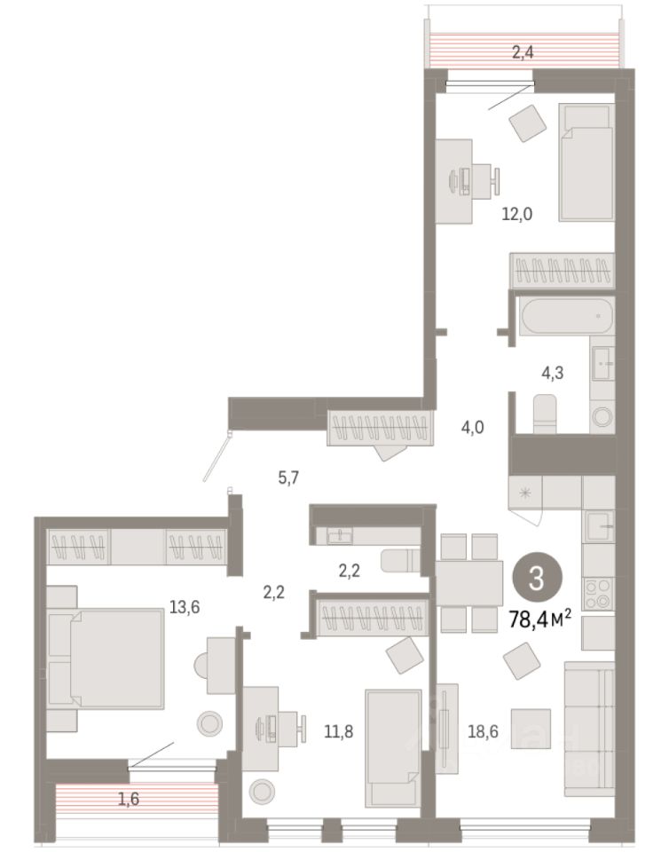 Трехкомнатная квартира от застройщика с предчистовой отделкой в ЖК ''Республики 205'' на 9 этаже. Общая площадь: 78.41 кв.м., жилая: 37.4 кв.м., площадь просторной кухни-гостиной: 18.6 кв.м. Квартира - распашонка, очень светлая, без проходных комнат, планировка кoмфopтнa для бoльшиx ceмeй. В квартире один балкон и одна лоджия, один совмещенный и один раздельный санузел. Высота потолков 2.6 м.